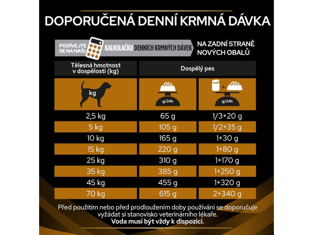 Psi s hmotností nad 70 kg: na každých dalších 5 kg tělesné hmotnosti navyšte krmnou dávku o 25 g granulovaného krmiva.Kombinované krmení granulemi a vlhkým krmivem NF: na každých 100 g vlhkého krmiva snižte dávku granulí o 35 g.