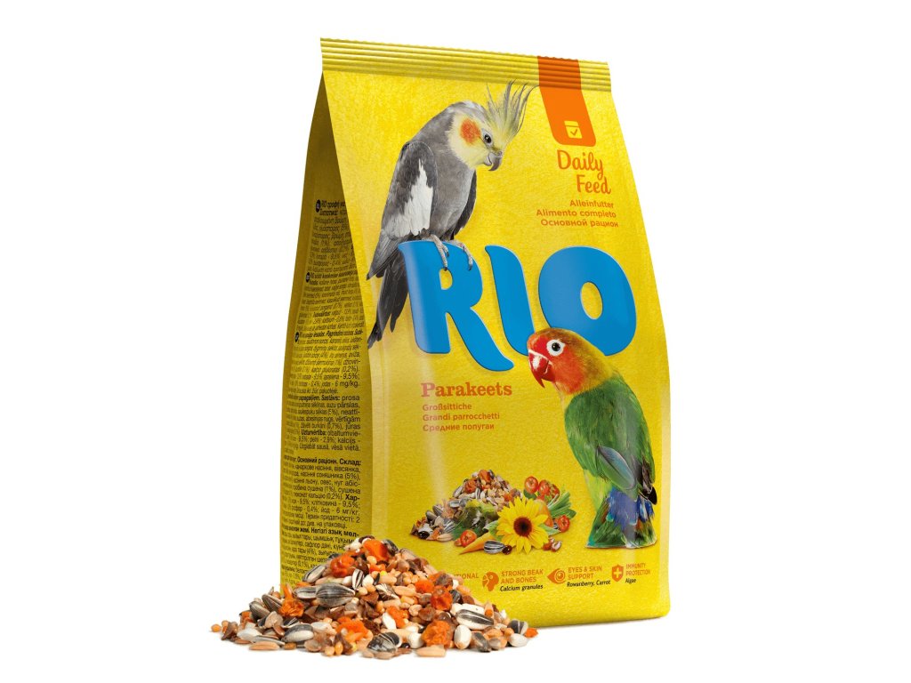 RIO bohatá krmná směs pro střední papoušky jako jsou korely, amazoňan, hrdličky, apod. Je tvořena pestrou skladbou semen a bobulí ze zahrádky, zeleninou i polními plodinami a samozřejmě nezbytným gritem. Strava je velmi chutná, podporuje zdravé trávení, má regenerační účinky a současně poskytuje exotickým ptákům v domácím chovu dostatek všech vitaminů a nezbytných minerálních látek. Je ideální i v období přepeřování či hnízdění, kdy jsou okrasní ptáci náročnější na stravu.