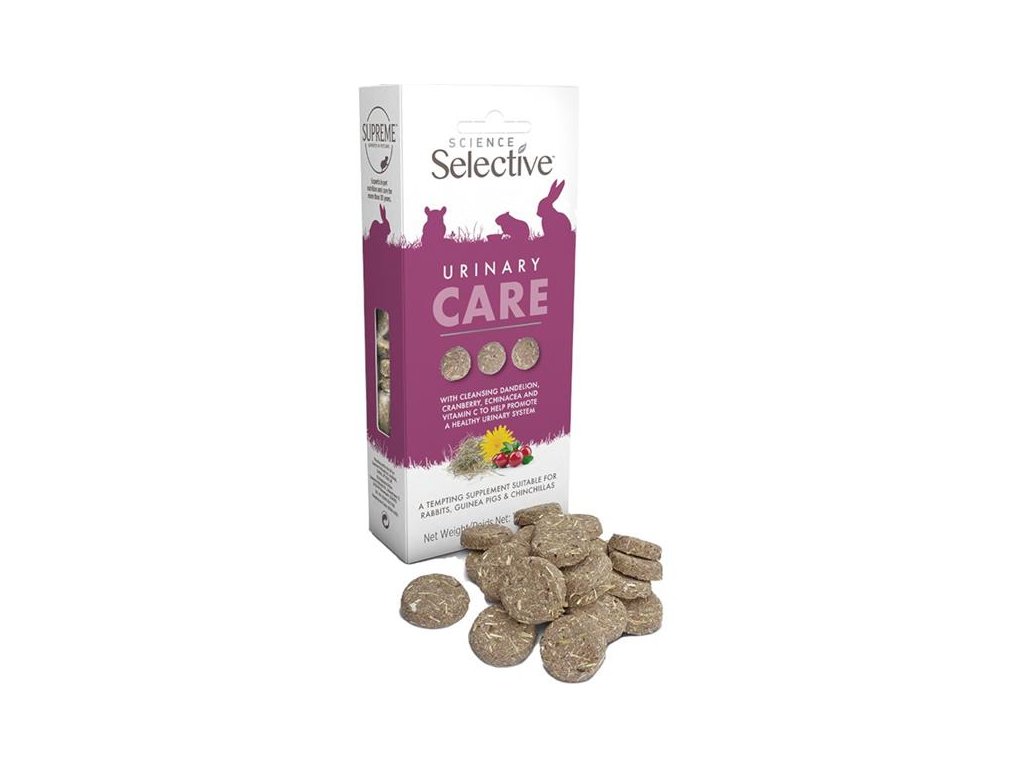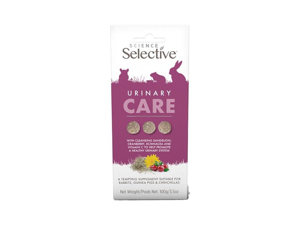 Chutné pamlsky Science Selective Urinary Care obsahují lněné semínko, pampelišku, brusinky, echinaceu a vitamín C. Pomáhají podporovat zdraví močových cest u králíků, morčat a činčil se sklony k zánětům nebo infekcím močových cest a ledvin a k tvorbě močových kamenů. Pamlsky jsou ideální pro krmení z ruky – k navázání či prohloubení vztahu s drobným mazlíčkem. Složení je čistě přírodní, bez umělých barviv, příchutí a přidaných cukrů.