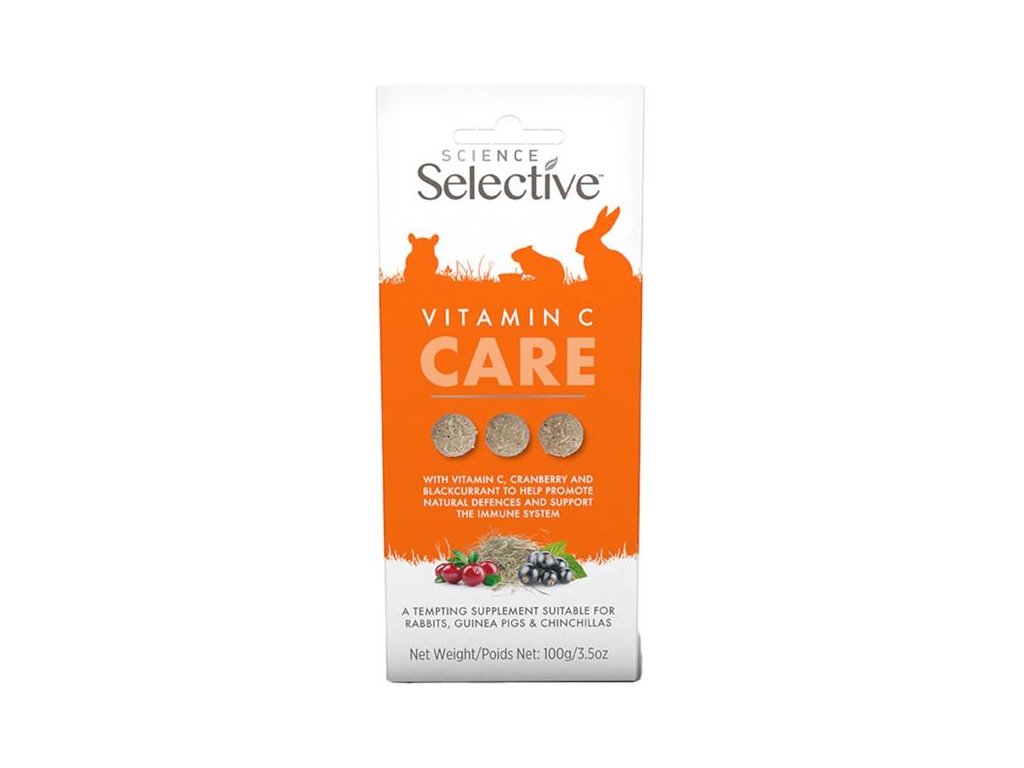 Chutné pamlsky Science Selective Vitamin C Care obsahují lněné semínko, brusinky, černý rybíz a vysoké množství vitamínu C. Pomáhají podporovat imunitu u králíků, morčat a činčil, kteří trpí nedostatkem vitamínu C (kurdějemi), mají oslabenou obranyschopnost, respirační obtíže nebo problémy s močovým ústrojím. Pamlsky jsou ideální pro krmení z ruky – k navázání či prohloubení vztahu s drobným mazlíčkem. Složení je čistě přírodní, bez umělých barviv, příchutí a přidaných cukrů.