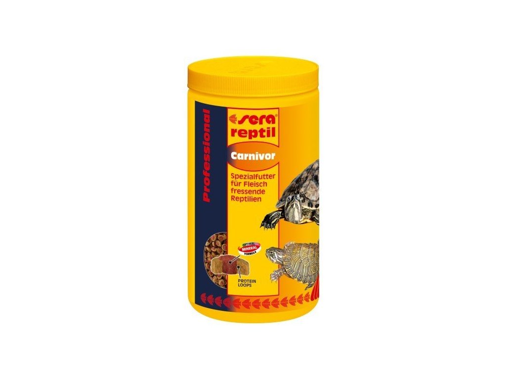 Reptil Professional Carnivor je základní krmivo bez barviv a konzervačních látek z plovoucích dvoubarevných granulí pro všechny masožravé plazy jako např. vodní želvy. Vnější prstenec granulí obsahuje vyváženou směs vodních organizmů jako ryby, gammarus a krill, poskytuje vysoce kvalitní bílkoviny a omega mastné kyseliny. Jádro granulí je extrudované za nízkých teplot tudíž velmi šetrně a je bohaté na životně důležité vitaminy, minerání látky a řasy pro posílení imunity. Granule obsahují optimální poměr vápníku a fosforu pro zdravý růst kostí a krunýře vašeho mazlíčka.