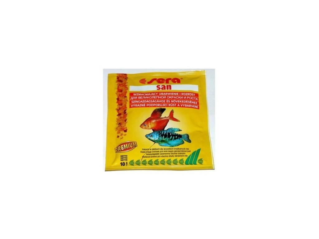Vločkové krmivo s rybí a obilnou moučkou, mořskými řasami a řasou spirulinou, které podporuje překrásné vybarvení všech akvarijních ryb. Sera San zajistí optimální růst a nejlepší chovatelské výsledky. Je dobře přijímán i vybíravými jedinci. Skladba krmiva tvořená až 40 složkami pokryje denní potřeby výživy ryb žijících ve společných nádržích. Přirozené vybarvení ryb je umocněno vysokým obsahem řasy spirulina a přírodními karotenoidy.