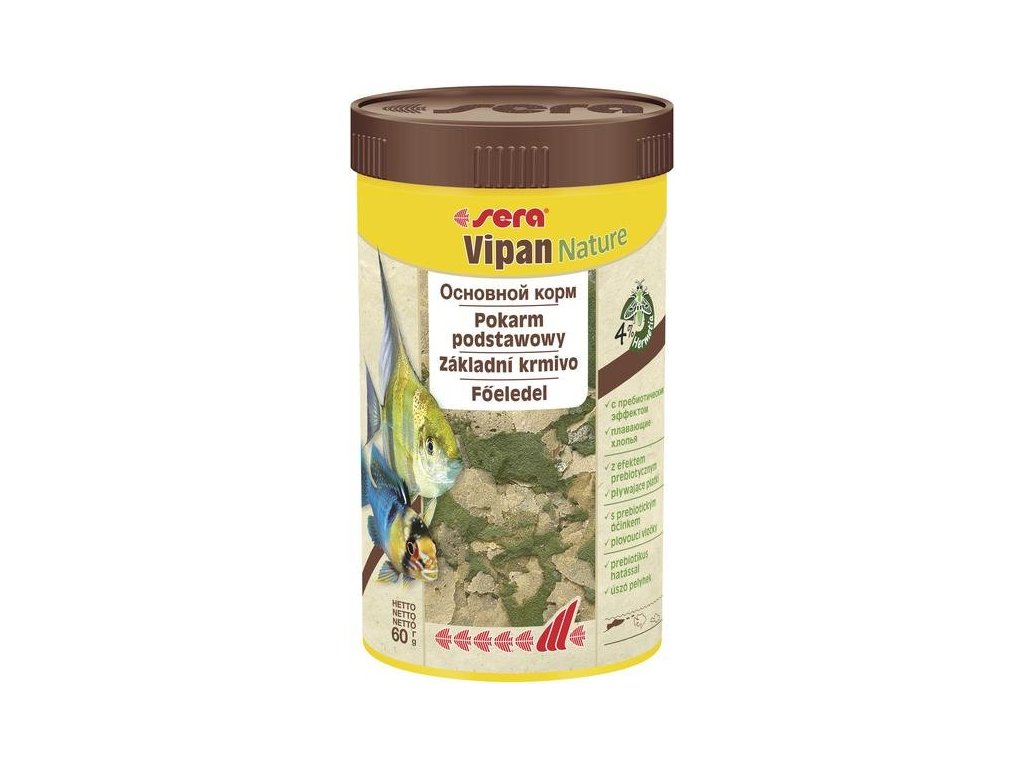 Sera Vipan Nature je přírodní vločkové základní krmivo pro okrasné ryby s obsahem hmyzí moučky. Bez barviv a konzervačních látek. Směs obsahuje 4 % hmyzí moučky z mušek hermetia, která je zdrojem vysoce kvalitních bílkovin. Pečlivě vybrané přírodní komponenty a prebiotika podporují zdravý růst a vývoj ryb. Vločky si dobře drží svůj tvar, tím pádem nekalí vodu.