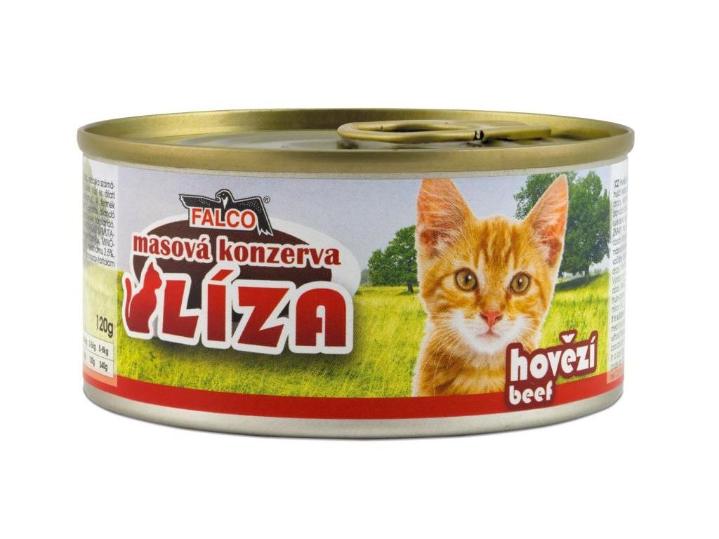 Konzerva řady LÍZA má vynikající nutriční a dietní hodnoty, vysoký obsah hořčíku, který ovlivňuje správnou funkci svalů a nervů, dále pak obsahuje sodík a vápník, jenž příznivě působí na zpevňování kostí v kloubech. Vše je v přírodní formě. Obsahuje hovězí, které má vysoký obsah esenciálních aminokyselin, železa a vitamínu B2. Dále obsahuje proteiny, jenž působí na růst svalů. Podporuje žvýkací svalstvo a je vynikající na kondici i srst. Kosti v konzervě nejsou nebezpečné, díky sterilizaci, která se provádí při vysokém tlaku a teplotě, jsou zcela měkoučké a lze je rozmáčknout mezi prsty. Kosti jsou důležitým prvkem ve stravě mazlíčka, obsahují důležité minerální látky. Při krmení konzervami, které obsahují kosti, nemusí chovatelé dokupovat žádné další vitamíny obsahující minerální látky. Konzerva LÍZA je vhodná pro všechny věkové kategorie a všechna plemena. Všechny naše produkty jsou přírodní a bez jakýchkoliv barviv, aromat, konzervantů, chemikálií, obilovin, rýže nebo sóji. Receptury jsou sestaveny veterinářem a zároveň zakladatelem MVDr. Jiřím Sokolem. FALCO konzervy mají trvanlivost 3 roky. Vydrží v chladu kolem 7 dní nebo dle Vašeho uvážení. Složení: Maso a vedlejší produkty živočišného původu (hovězí droby, vepřové droby, hovězí maso). Jakostní znaky: hrubý protein 16%, hrubý tuk 11%, hrubá vláknina 0,5%, hrubý popel 2,5%, vlhkost 70%, vysoký přirozený obsah vitamínů (A,E,D) a aminokyselin (lysin, methionín, cystín)