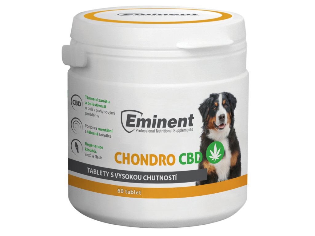 Eminent Chondro CBD je speciálně vytvořený výživový doplněk ve formě tablet, navržený tak, aby podporoval zdraví kloubních chrupavek vašeho psa, podporoval regeneraci buněk a zmírňoval zánět, který je často spojen s kloubními onemocněními.