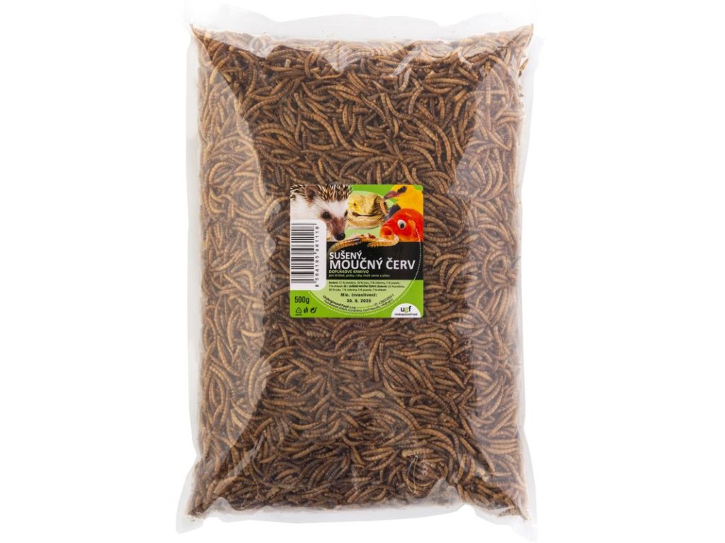 Larvy sušeného moučného červa jsou vhodným doplňkem stravy ptáků vč. drůbeže, ryb, ještěrek, leguánů, želv, žab, ježků, křečků, myší, potkanů a jiných malých savců, koček a psů.