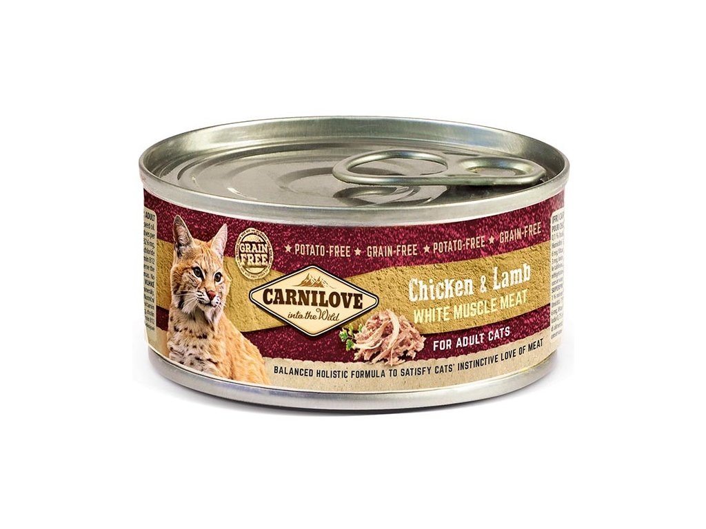 Carnilove Cat konzerva Mus Meat Chicken & Lamb je kompletní superprémiové vlhké krmivo pro dospělé kočky. Recepturu z kuřecího a jehněčího si zamiluje i ten největší kočičí mlsoun. Brusinky se postarají o zdravé močové cesty Vaší kočky. Přidaný lněný olej zajistí přirozenou imunitu. Konzerva obsahuje pouze trhané maso z kuřat, jehňat a lahodný vývar.