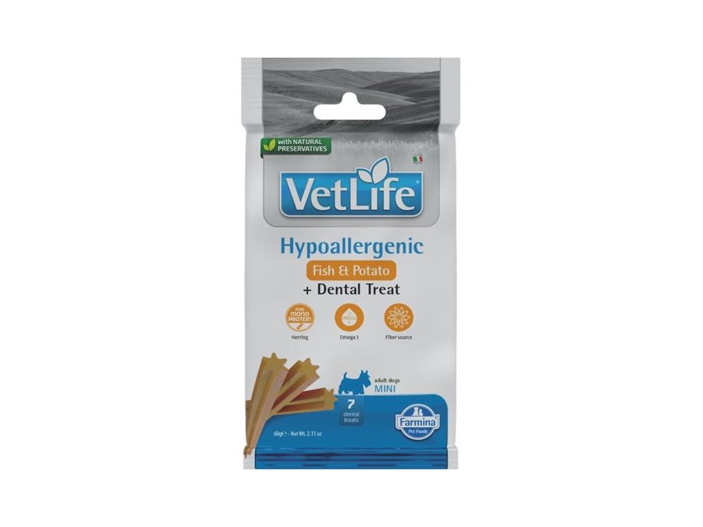 Kolem 80 % dospělých psů čelí problémům v dutině ústní. Parodontální onemocnění je navíc spojeno s vyšším rizikem srdečních a ledvinových problémů. Předcházejte těmto potížím s pomocí dentálních tyčinek Vet Life Dental Treat určených pro psy a štěňata (od 4 měsíců) středně velkých a velkých plemen s dietním omezením.Pamlsky Vet Life Dental Treat jsou vyvinuty speciálně tak, aby si na nich váš pes pochutnal, vyčistil si jimi zuby, namasíroval dásně a přitom dodržel předepsanou klinickou dietu. Vet Life Hypoallergenic Dental Treat jsou monoproteinové pamlsky se sleděm, obohacené o omega-3 mastné kyseliny a vlákninu pro snížení rizika nežádoucích reakcí na potraviny a podporu zdraví trávicího systému. Jsou určené pro psy s hypoalergenní veterinární dietou.