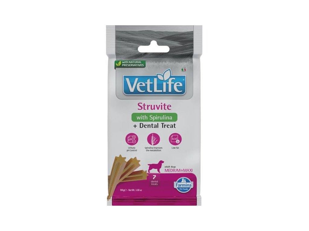 Kolem 80 % dospělých psů čelí problémům v dutině ústní. Parodontální onemocnění je navíc spojeno s vyšším rizikem srdečních a ledvinových problémů. Předcházejte těmto potížím s pomocí dentálních tyčinek Vet Life Dental Treat určených pro psy a štěňata (od 4 měsíců) malých plemen s dietním omezením.Pamlsky Vet Life Dental Treat jsou vyvinuty speciálně tak, aby si na nich váš pes pochutnal, vyčistil si jimi zuby, namasíroval dásně a přitom dodržel předepsanou klinickou dietu. Vet Life Struvite Dental Treat jsou nízkotučné pamlsky s okyselujícími látkami pro regulaci pH moči a minimalizací tvorby struvitových urolitů. Obsahují také spirulinu pro zlepšení metabolismu. Jsou určené pro psy s veterinární dietou zaměřenou na prevenci a léčbu tvorby struvitových močových kamenů.