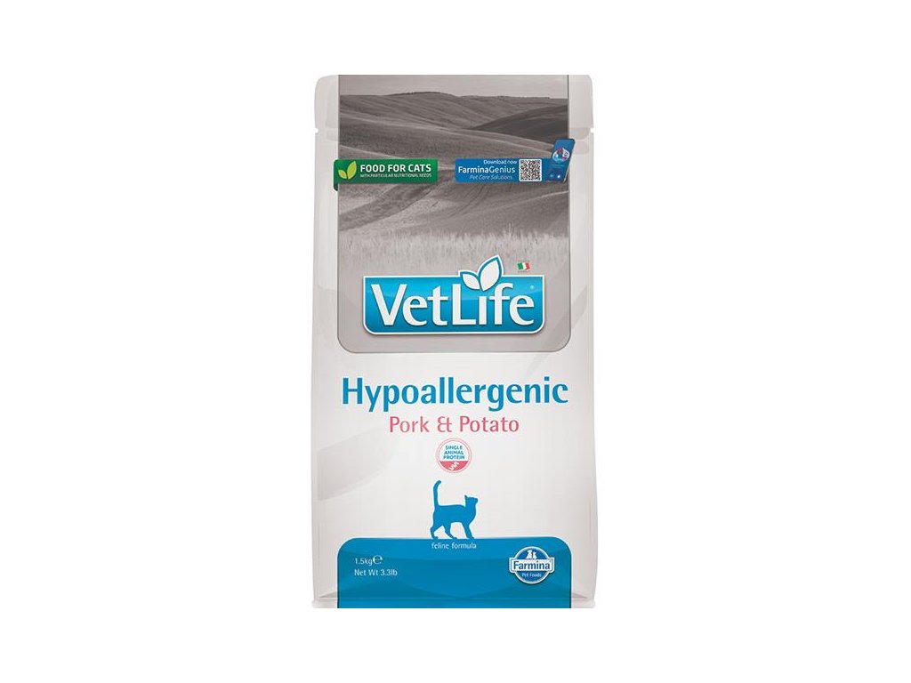 Farmina Vet Life Hypoallergenic Pork & Potato je kompletní suché dietetické krmivo pro dospělé kočky určené ke snížení výskytu potravinových alergií a nesnášenlivostí (intolerancí). Granule se používají také pro podporu správných funkcí kůže v případě kožních poruch a nadměrné ztráty srsti. Jediným zdrojem proteinů v krmivu je dehydratovaný vepřový protein a jediným zdrojem sacharidů batáty, čímž je eliminována nesnášenlivost vůči jiným složkám potravy.