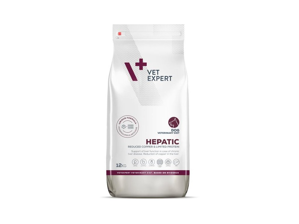 Dieta Hepatic Dog je jediné krmivo na světě s unikátním složením, obsahující artyčok a fosfolipidy, které prokazatelně podporují jaterní funkce v případě jejich selhání. Jedná se o kompletní, kompletní dietní krmivo pro psy, jehož podávání podporuje činnost jater při jejich chronické insuficienci a snižuje usazování mědi v játrech. Obsahuje střední množství vysoce kvalitních bílkovin (z drůbeže, kukuřice, rýže), vysoký obsah esenciálních mastných kyselin, vysoce stravitelné sacharidy a nízký obsah mědi.