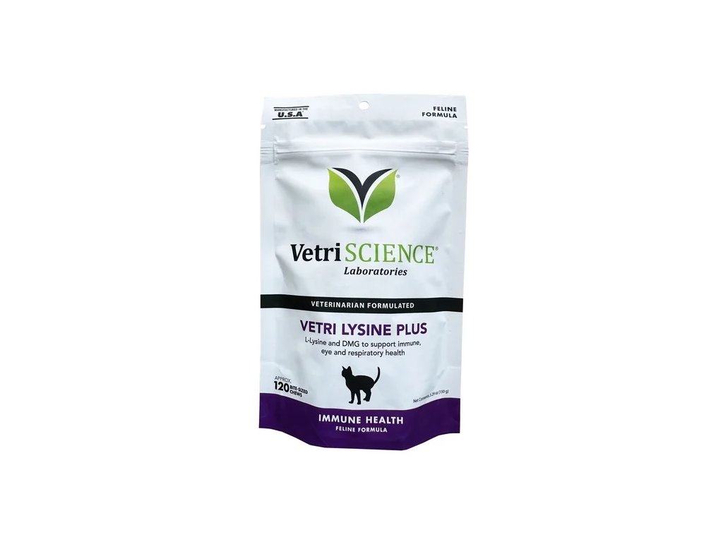 Vetri Lysine Plus obsahuje přibližně 120 žvýkacích pamlsků. Účinné látky Vetri Lysine Plus L-Lysine je aminokyselina, která podporuje produkci protilátek, hormonů a enzymů. Podporuje tvorbu kolagenu, čímž podporu hojení tkání. L-Lysine soupeří s L-Argininem, což je aminokyselina, kterou vyžadují herpes viry při své replikaci. DMG je přechodný metabolit (látka, která se rychle rozkládá v ostatních životně důležitých tkáních v těle), který je přirozeně v těle v malém množství produkován. DMG poskytuje užitečné stavební kameny, včetně methylových skupin, které podporují produkci vitamínů, hormonů, neurotransmiterů, protilátek, nukleových kyselin a dalších metabolicky aktivních molekul. Zvířata produkují DMG v malých množstvích a výzkumy naznačují, že se doplněním DMG zvyšuje využití kyslíku na buněčné úrovni a podporuje se tím imunitní odpověď (protilátky a produkce lymfocytů). Návod k použití / dávkování žvýkacích pamlsků Dospělé kočky: Podávejte 1 až 2 žvýkací pamlsky 2× denně Koťata: Podávejte 1 žvýkací pamlsek 2× denně Jedno balení obsahuje 120 žvýkacích kousků. Složení Vetri Lysine Plus Průměrný obsah aktivních složek ve 2 žvýkacích pamlscích