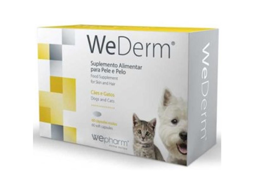 Kožní onemocnění u psů a koček jsou velmi častá a objevují se v podobě dermatitidy, svědění, erythema, vypadávání chlupů, rohovatění kůže a mnoho jiných. WeDerm® je komplex bohatý na esenciální mastné kyseliny, vitamíny a minerály, které podporují jedinečnou a vyváženou podporu zdravé pokožky a srsti.