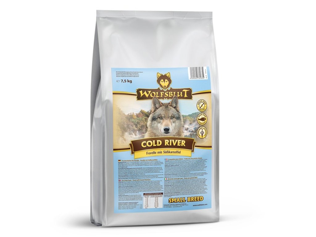 Vlci loví svou kořist od Skalistých hor Severní Ameriky, arktické tundry, hor, lesů a řek Evropy až po pouště a stepi střední Asie. To jim dodává maso a ryby a vnitřnosti bohaté na živiny, ale také zeleninu, ovoce, bobule, kořeny a bylinky prostřednictvím obsahu žaludku kořisti. Obilí zde není zahrnuto. Vlk tak přijímá potřebné vitamíny, minerály, stopové prvky, enzymy a druhotné rostlinné látky. Vzhledem k tomu, že vlk je předkem všech psů, naše suché krmivo pro psy Wolfsblut je založeno na přirozených stravovacích návycích vlka. Obsahuje hodně masa nebo ryb v kombinaci se superpotravinami, které obsahují hodnotné ingredience – stejně jako v přírodě, bez obilovin. Náš výběr výjimečných druhů masa a superpotravin bohatých na živiny vychází z vlčích biotopů a jejich pestré stravy. Wolfsblut nabízí každému psovi druhově vhodnou a originální stravu a díky rozmanitosti odrůd si každý najde něco, co snese. Receptura suchého krmiva COLD RIVER SMALL BREED kombinuje výživu vlků s nejnovějšími vědeckými poznatky o správné výživě psů.