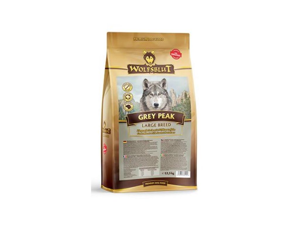 Vlci loví svou kořist ve Skalistých horách Severní Ameriky, arktické tundře, v horách a lesích Evropy a dokonce i v pouštích a stepích střední Asie. To jim poskytuje maso a vnitřnosti bohaté na živiny, ale také zeleninu, ovoce, bobule, kořeny a bylinky prostřednictvím obsahu žaludku kořisti. Obilí zde není zahrnuto. Vlk tak dostává potřebné vitamíny, minerály, stopové prvky, enzymy a sekundární rostlinné látky. Vzhledem k tomu, že vlk je předkem všech psů, naše mokré krmivo pro psy Wolfsblut je založeno na přirozených stravovacích návycích vlka. Obsahuje hodně masa nebo ryb v kombinaci se superpotravinami, které obsahují hodnotné ingredience – stejně jako v přírodě, bez obilovin. Náš výběr výjimečných mas a superpotravin bohatých na živiny je založen na vlčím prostředí a jeho rozmanité stravě. Wolfsblut nabízí každému psovi druhově vhodnou a přirozenou stravu a díky rozmanitosti odrůd si každý něco toleruje. Receptura na suché krmivo GREY PEAK LARGE BREED kombinuje stravu vlka s nejnovějšími vědeckými poznatky o správné výživě psů.