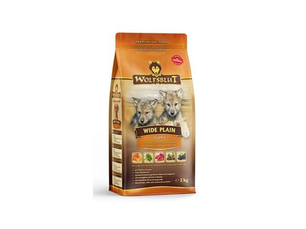 Vlci loví svou kořist ve Skalistých horách Severní Ameriky, arktické tundře, v horách a lesích Evropy a dokonce i v pouštích a stepích střední Asie. To jim poskytuje maso a vnitřnosti bohaté na živiny, ale také zeleninu, ovoce, bobule, kořeny a bylinky prostřednictvím obsahu žaludku kořisti. Obilí zde není zahrnuto. Vlk tak dostává potřebné vitamíny, minerály, stopové prvky, enzymy a druhotné rostlinné látky. Vzhledem k tomu, že vlk je předkem všech psů, naše suché krmivo pro psy Wolfsblut je založeno na přirozených stravovacích návycích vlka. Obsahuje hodně masa nebo ryb v kombinaci se superpotravinami, které obsahují hodnotné ingredience – stejně jako v přírodě, bez obilovin. Náš výběr výjimečných mas a superpotravin bohatých na živiny je založen na vlčím prostředí a jeho rozmanité stravě. Wolfsblut nabízí každému psovi druhově vhodnou a přirozenou stravu a díky rozmanitosti odrůd si každý něco toleruje. Receptura na suché krmivo WIDE PLAIN PUPPY kombinuje stravu vlka s nejnovějšími vědeckými poznatky o správné výživě psů.