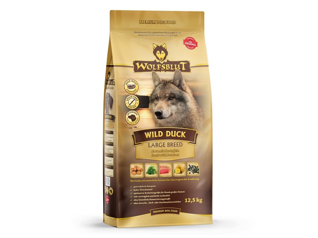 Vlci loví svou kořist od Skalistých hor Severní Ameriky, arktické tundry, hor a lesů Evropy až po pouště a stepi střední Asie. To jim dodává maso a vnitřnosti bohaté na živiny, ale také zeleninu, ovoce, bobule, kořeny a bylinky z obsahu žaludku kořisti. Obilí zde není zahrnuto. Vlk tak přijímá potřebné vitamíny, minerály, stopové prvky, enzymy a druhotné rostlinné látky. Vzhledem k tomu, že vlk je předkem všech psů, naše suché krmivo pro psy Wolfsblut je založeno na přirozených stravovacích návycích vlka. Obsahuje hodně masa nebo ryb v kombinaci se superpotravinami, které obsahují hodnotné ingredience – stejně jako v přírodě, bez obilovin. Náš výběr výjimečných druhů masa a superpotravin bohatých na živiny vychází z vlčích biotopů a jejich pestré stravy. Wolfsblut nabízí každému psovi druhově vhodnou a originální stravu a díky rozmanitosti odrůd si každý najde něco, co snese. Receptura suchého krmiva WILD DUCK LARGE BREED kombinuje výživu vlků s nejnovějšími vědeckými poznatky o správné výživě psů.